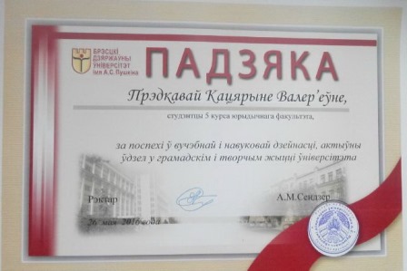 Благодарностью университета за успехи в учебной и научной деятельности, активное участие в общественной и творческой жизни университета была награждена студентка 5 курса юридического факультета Предкова Екатерина - инспектор по кадрам частного предприятия "Юридическое бюро Олега Панина".