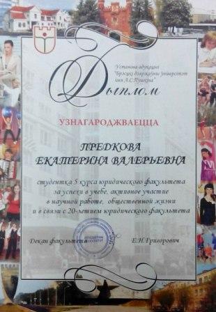 Предкова Екатерина награждена дипломом БрГУ имени А.С. Пушкина