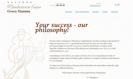Она позволяет ознакомиться с деятельностью частного предприятия "Юридическое бюро Олега Панина" не только гражданам Республики Беларусь и ближнего зарубежья, но и гражданам других стран.